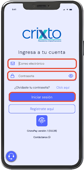 1. Ingrese a la plataforma Crixto Pay desde su dispositivo móvil haciendo uso de su usuario y contraseña.