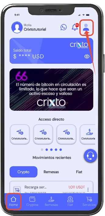 2. Ya dentro de su cuenta Crixto Pay , ubique en la parte superior derecha el ícono de Perfil y dar clic.