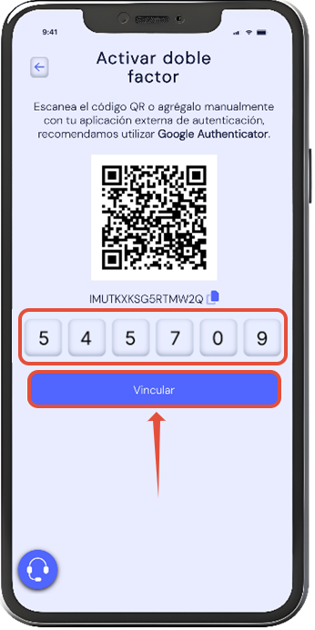 7. Una vez escaneado el QR, la aplicación generará un código de 6 dígitos, que debe ser ingresado en la parte de abajo de la pantalla, para posterior presionar el botón Vincular.