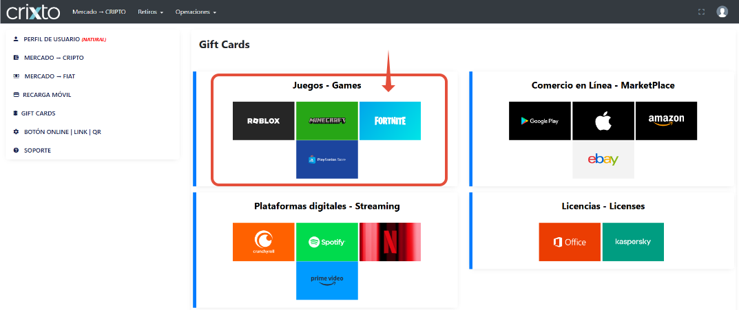 2.- Ubique la opción de "GIFT CARDS", en el menú ubicado en la parte izquierda de la pantalla.