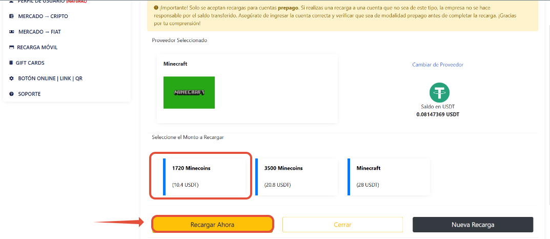 Con tu cuenta Crixto podras usar tus USDT para comprar y obsequiar GIFT CARD para Minecraft de forma rápida y sin complicaciones. Los pasos son muy sencillos a continuación te explicamos cómo hacerlo.