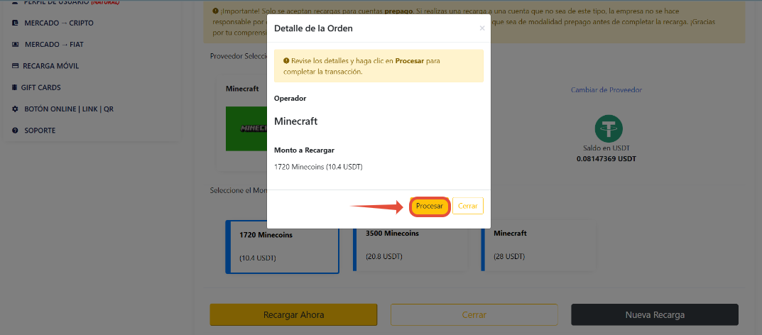 7.- Aparecerá una nueva pantalla "Detalle de la Orden", donde se verá los datos del operador y el monto a recargar, una vez verificada la información dar clic en la opción “Procesar”.