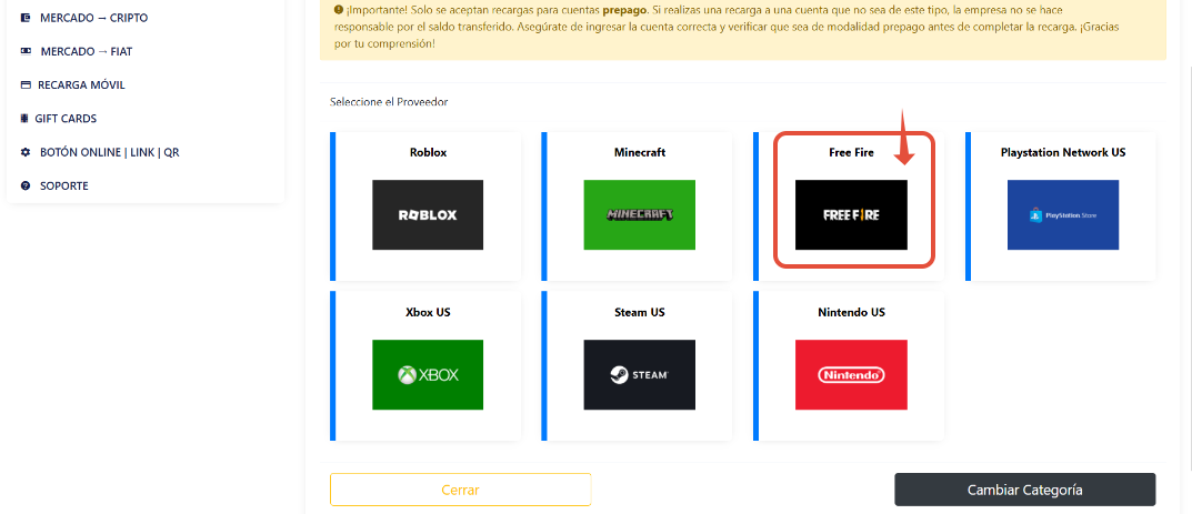 Comprar GIFT CARD para Free Fire en Crixto