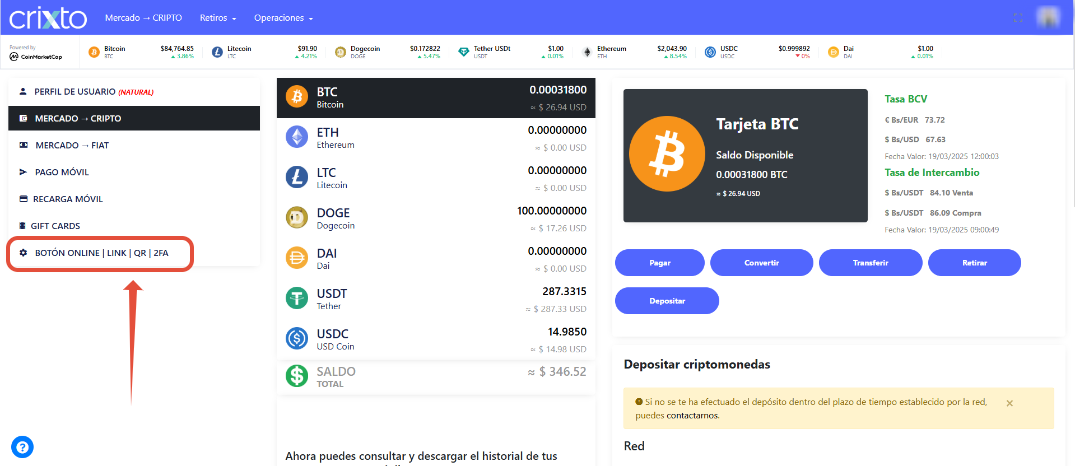 1. Ingrese a su cuenta Crixto haciendo uso de su usuario y contraseña.