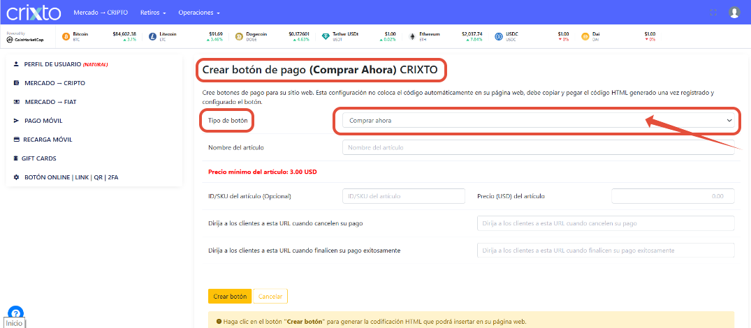 5.- Una vez habilitada la sección "Crear botón de pago (Comprar Ahora) CRIXTO" el usuario debe seleccionar en “Tipo de botón” la opción "Comprar ahora".